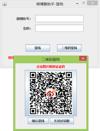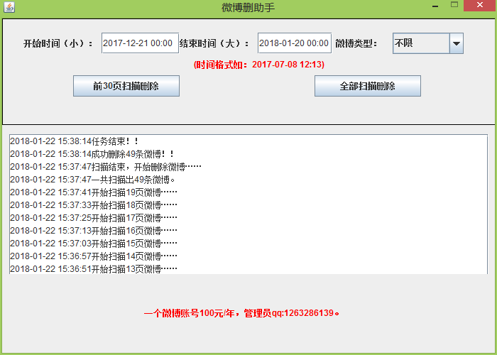 支持微博账号登陆(需关闭微博登陆保护)和二维码扫码登陆(推荐)这两种模式,比较推荐二维码扫码登陆模式,既快捷又安全。 选择微博时需要填写时间段,时间格式如下(2018-01-22 00:00),同时需要选择微博的类型(转发,直发,不限)。 此软件是七日情侣团队自己研发,删除速度为市面软件的两倍,支持二维码扫描,不需提供微博账号和密码绝对安全!!! 资费标准:30元/月,100元/年 点我下载此软件